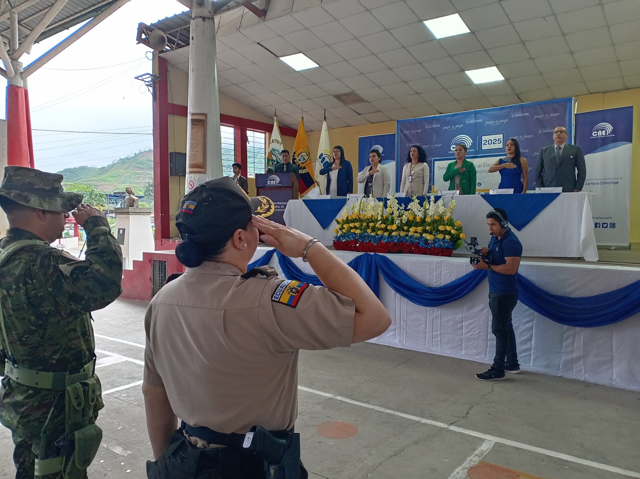 El acto inició con la entrada del estandarte nacional del Batallón de Selva N.º 62 “Zamora” y la entonación del Himno Nacional del Ecuador, símbolos del respeto, civismo y solemnidad que caracterizan este proceso democrático.
