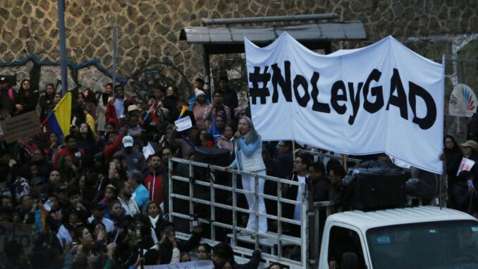 Unas 400 personas marcharon este jueves por el centro de Quito para protestar contra el nuevo proyecto de ley impulsado por el presidente de Ecuador, Daniel Noboa, que busca reformar el esquema de gasto de los gobiernos locales, entre ellos municipios y prefecturas provinciales.