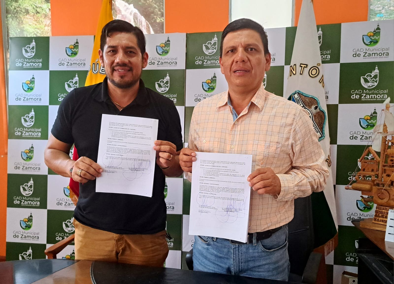 El pasado jueves 5 de septiembre, en el despacho de la Alcaldía de Zamora, se formalizó la firma del convenio entre el alcalde Manuel González y el presidente del GAD Parroquial de Timbara, Jhonatan Chiriboga, para la realización del Octavo Festival de la Caña y la Melcocha, que tendrá lugar el domingo 29 de septiembre, en el marco de los 475 años de Fundación de Zamora.