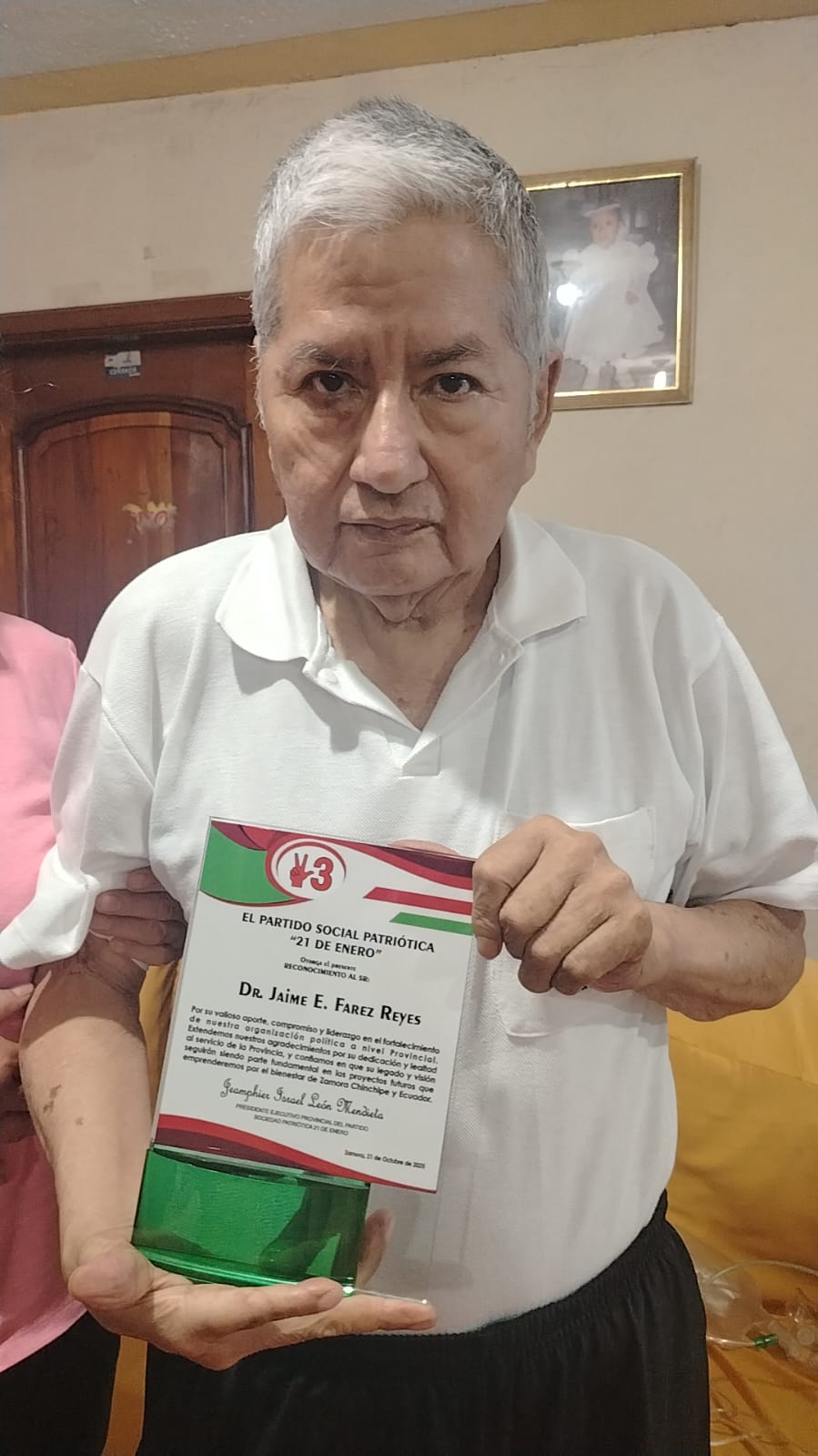 Durante la ceremonia, León destacó la trayectoria del homenajeado, resaltando su dedicación y servicio a la comunidad desde los distintos espacios de gestión pública. “Vinimos a visitarlo porque nos complace verlo bien, y sobre todo porque ha compartido con nosotros su valiosa experiencia como presidente parroquial. El Partido Sociedad Patriótica 21 de Enero otorga este reconocimiento al Dr. Jaime Fárez por su valioso aporte, compromiso y liderazgo en el fortalecimiento de la organización política a nivel provincial. Por lo tanto, extienden el agradecimiento por su dedicación y lealtad al servicio de la provincia, confiando en que su legado y visión seguirán siendo parte fundamental de los proyectos futuros que impulsamos por el bienestar de Zamora Chinchipe y del Ecuador”, manifestó el Director Provincial.
