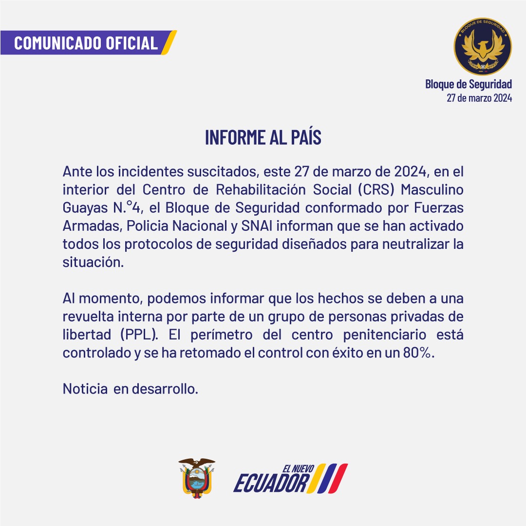 El presidente Daniel Noboa informó, en una publicación en la red social X (antes Twitter), que se retomó el control del Centro de Rehabilitación Social 4. Esto tras los incidentes registrados durante la noche de este miércoles, 27 de marzo de 2024, según información oficial, provocados por una revuelta interna por parte de un grupo de personas privadas de libertad (PPL).
