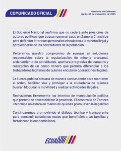 El Ministerio de Gobierno, emitió hoy un pronunciamiento oficial frente a los recientes hechos registrados en la provincia de Zamora Chinchipe, donde se han evidenciado intentos de paralización y manifestaciones vinculadas a intereses políticos asociados a la minería ilegal. En su comunicado, el Ejecutivo reafirmó que no cederá ante presiones de actores que buscan generar caos y aprovecharse de la vulnerabilidad social de la población.