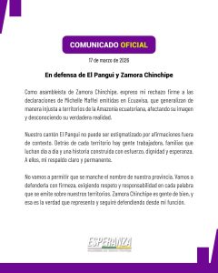 En este contexto, Aguilar convocó a los comuneros y a las comunidades afectadas por la problemática del agua a participar en una caminata pacífica que se realizará el miércoles 18 de marzo, con concentración a las 08:00 en el parque central de Yantzaza, desde donde se movilizarán hacia las oficinas de la Función Judicial del Ecuador, en el marco de la reinstalación de la audiencia de la acción de protección prevista para las 09:00.