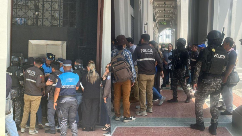 En los exteriores del Palacio Municipal, un grupo de aproximadamente 30 personas se concentró en el pasillo, al pie de una de las puertas de acceso ubicada hacia la Plaza de la Administración, donde gritaban consignas como: “Dictadura no, democracia sí” y “Fuera, Noboa”.