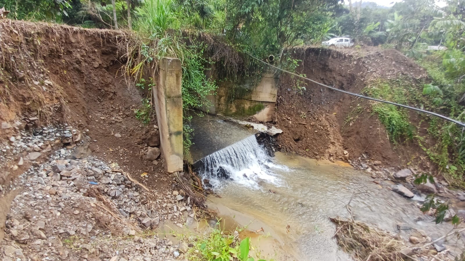 Durante el recorrido, se constató que una de las aletas del puente presenta socavación severa, ausencia de material pétreo de protección y exposición de elementos metálicos, lo que ha generado un estado de inestabilidad crítica. Según los moradores, cualquier nuevo incremento del caudal o movimiento del terreno podría ocasionar el colapso total de la estructura, dejando incomunicadas a las comunidades del sector.
